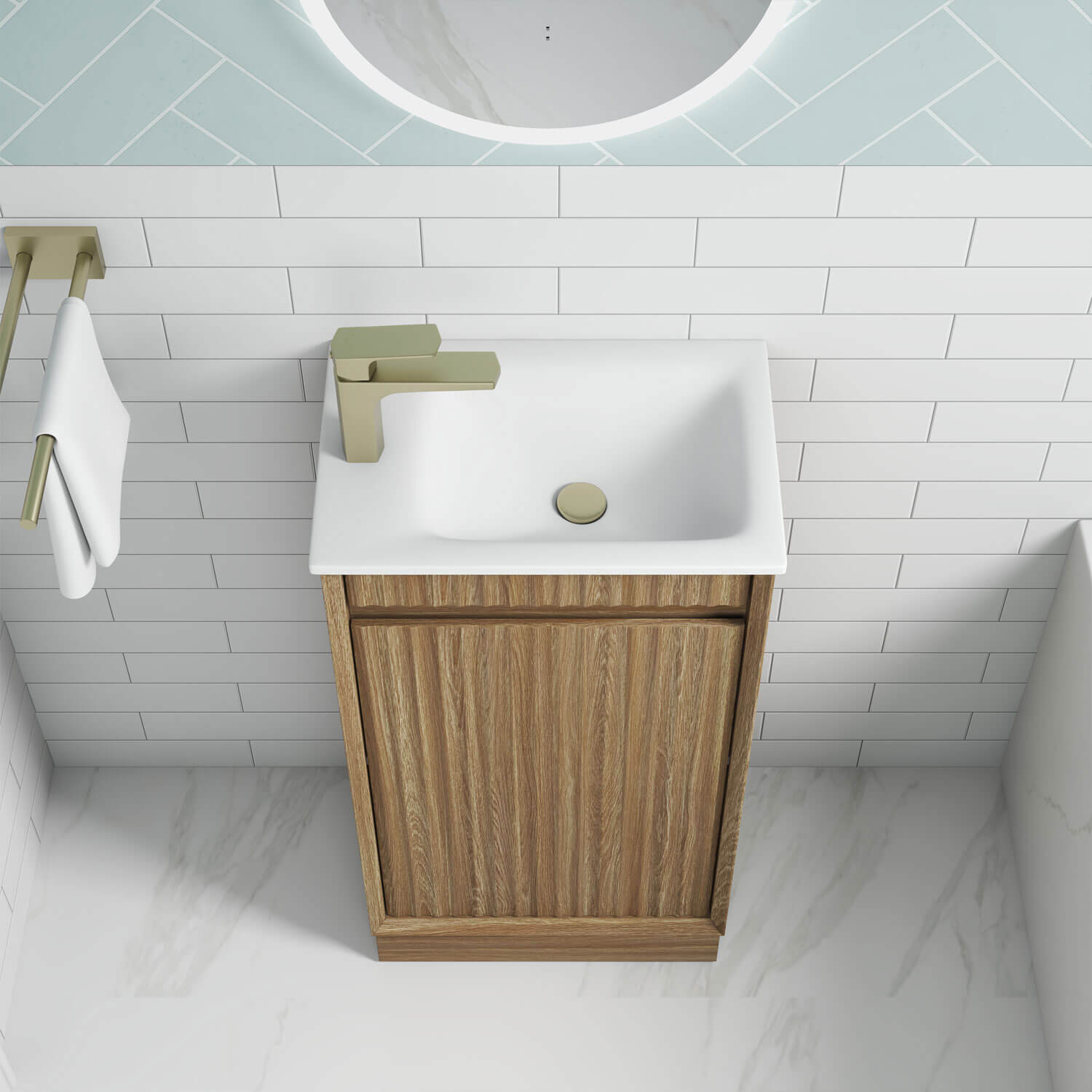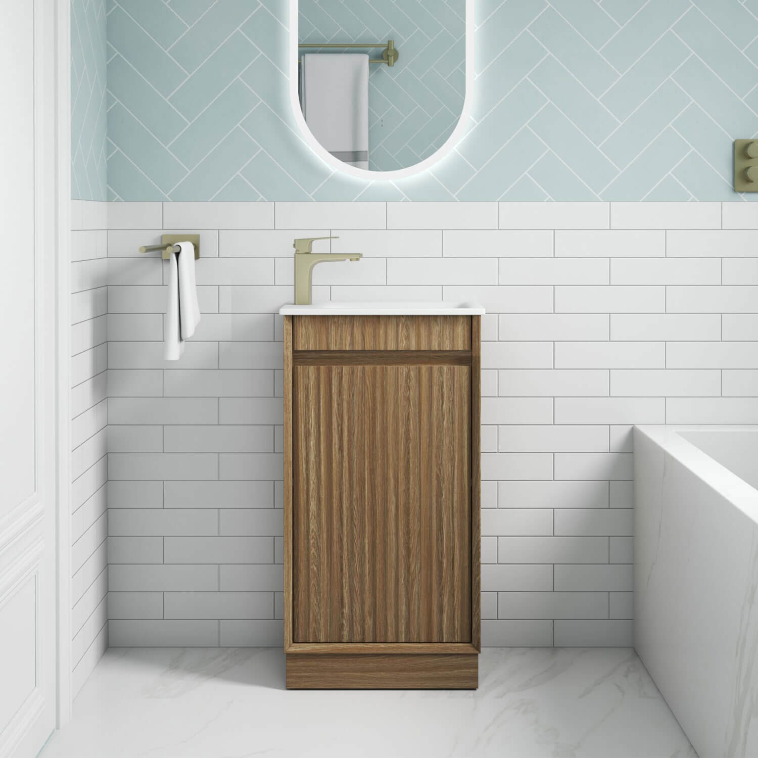 The contemporary wave groove in thermo laminate harvest oak or matte white colour finish adds rich texture and visual depth, while minimalist finger pull drawers maintain a clean, modern profile. Inside, a premium graphite interior offers a touch of luxury and smart storage—perfect for compact bathrooms that don’t compromise on style.