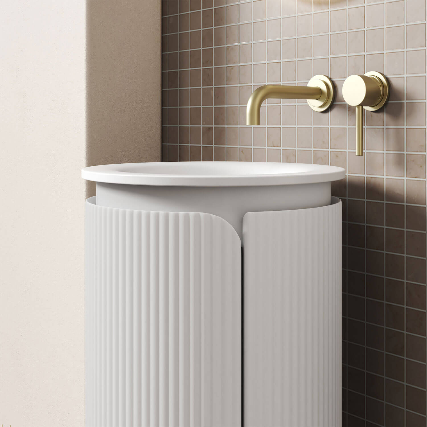 The stunning Civaro vanity features a sophisticated fluted cylinder base, offering a unique architectural touch that adds texture and depth to any bathroom. Crafted from premium-grade, durable timber plywood, it promises lasting quality and performance.
